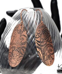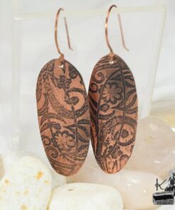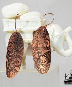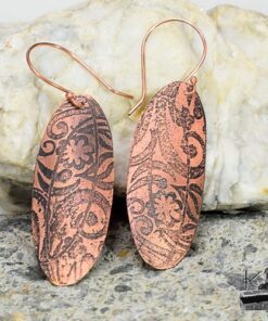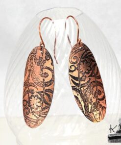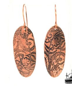 Boucles d’oreille entièrement faits main en cuivre electro-gravé en bain de sel. Les attaches sont également en cuivre.