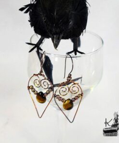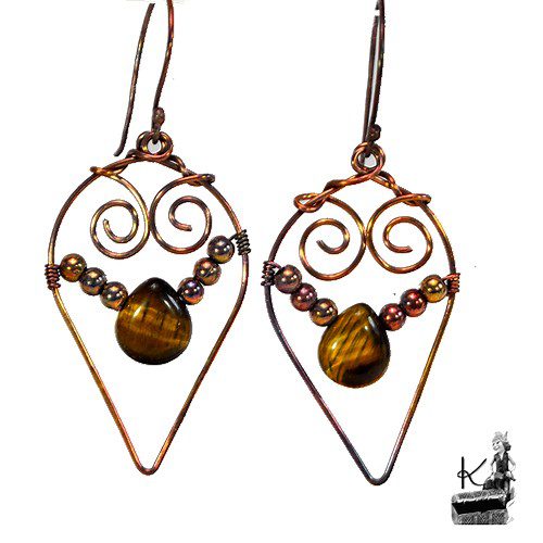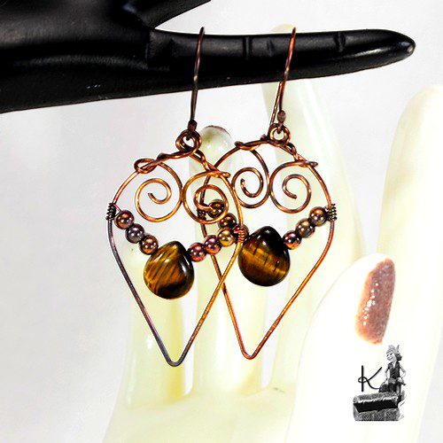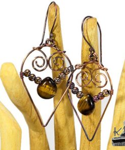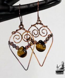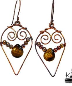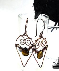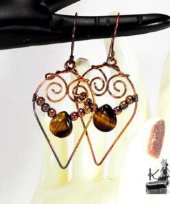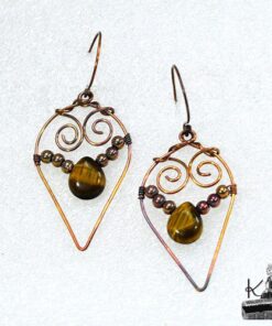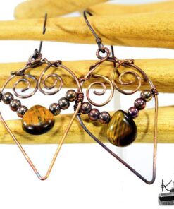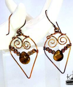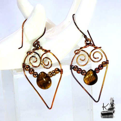 Boucles d’oreille entièrement faites main en cuivre avec la technique du wire wrapping avec des perles en cuivre et en oeil de tigre