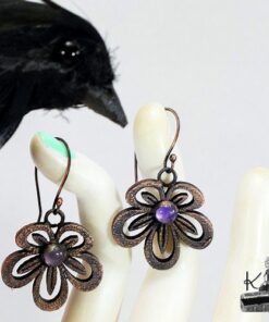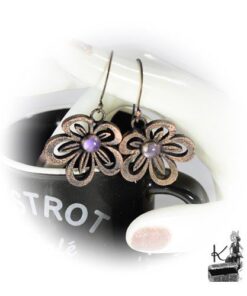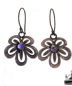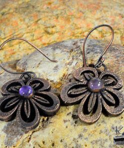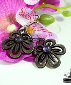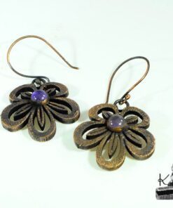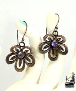 Boucles d’oreille entièrement faits main plaqués avec du cuivre et embellies avec 2 cabochons en améthyste. Les crochets sont faits main également et en cuivre.