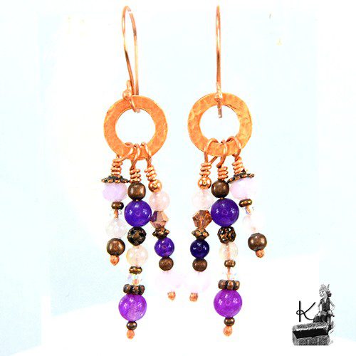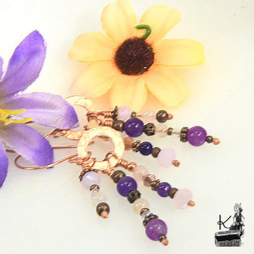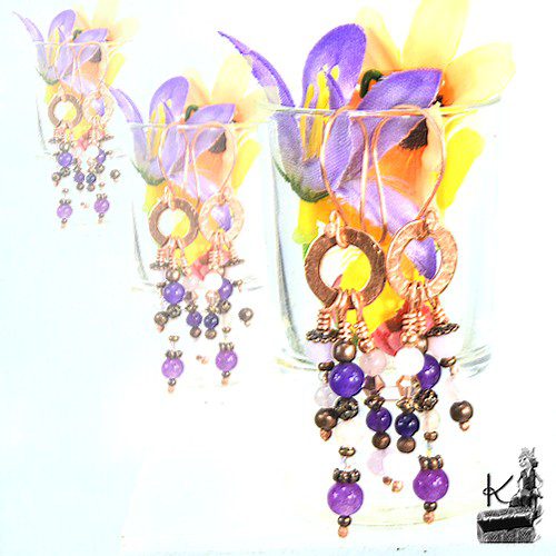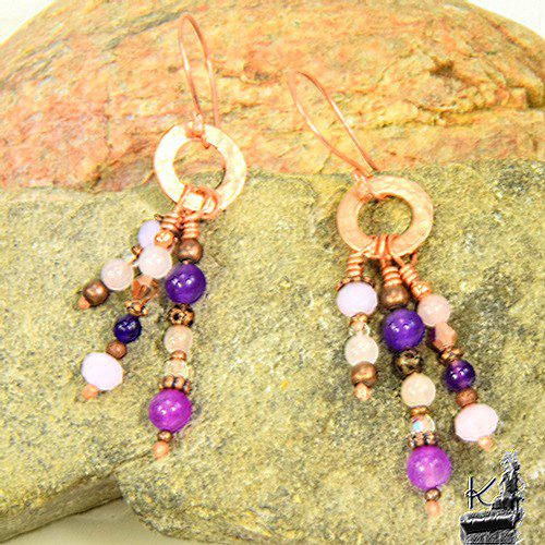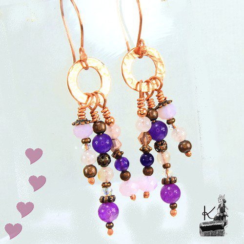 Boucles d’oreille en perles de jade, de cristaux tchèques, d’améthyste de quartz rose et perles en cuivre. Elles vont se patiner avec le temps. Les attaches sont également en cuivre naturel.