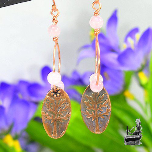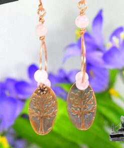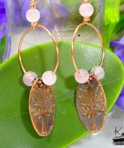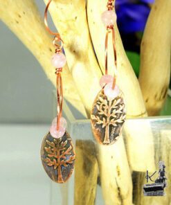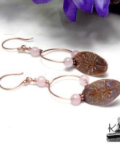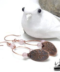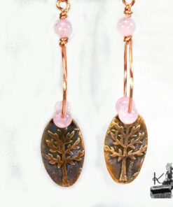 Boucles d’oreille entièrement faits main en cuivre électro-gravé en bain de sel avec des perles en quartz rose. Les attaches sont également en cuivre.