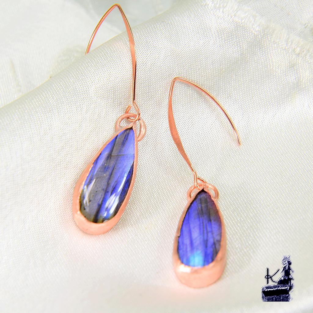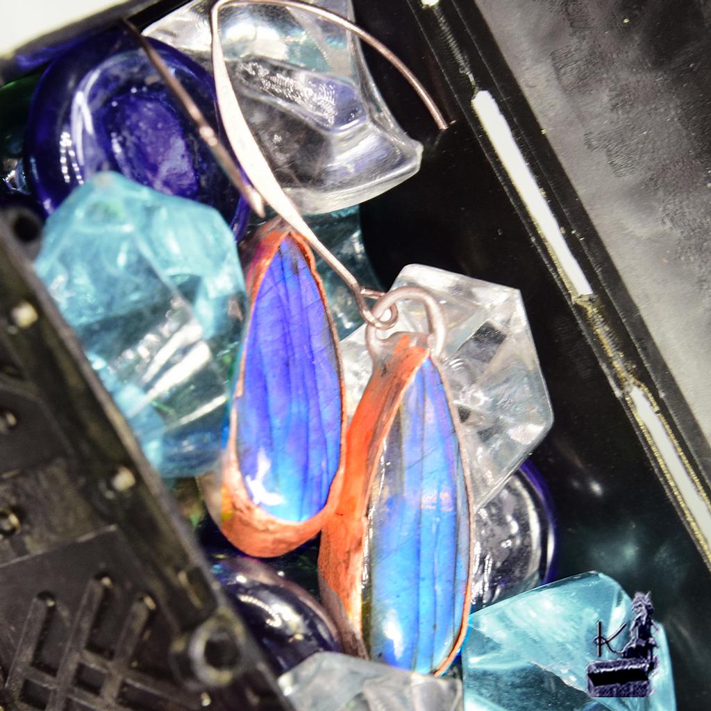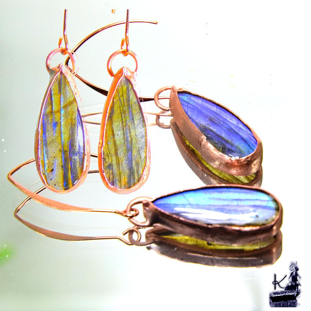 Pierres : Cabochons de Labradorite naturelle aux reflets labradorescents (bleus, verts ou dorés).