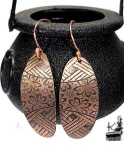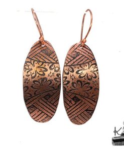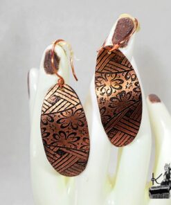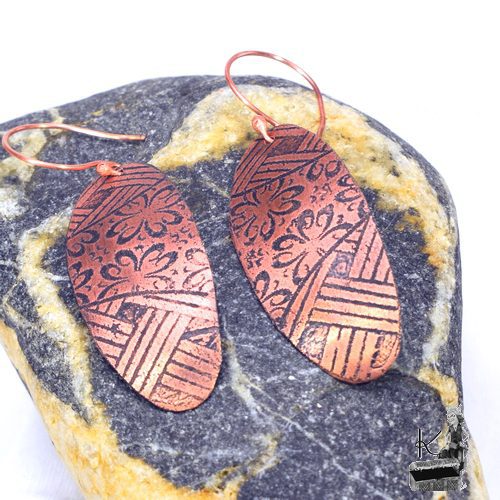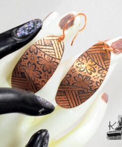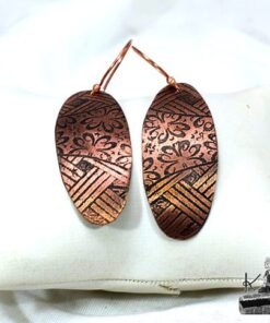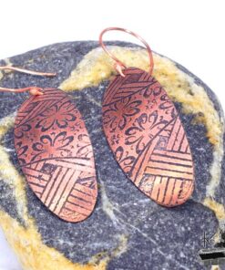 Boucles d’oreille entièrement faits main en cuivre electro-gravé en bain de sel. Les attaches sont également en cuivre.