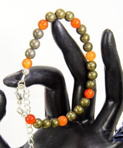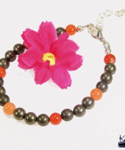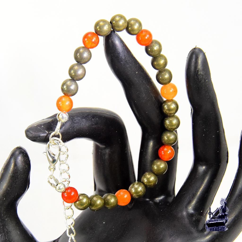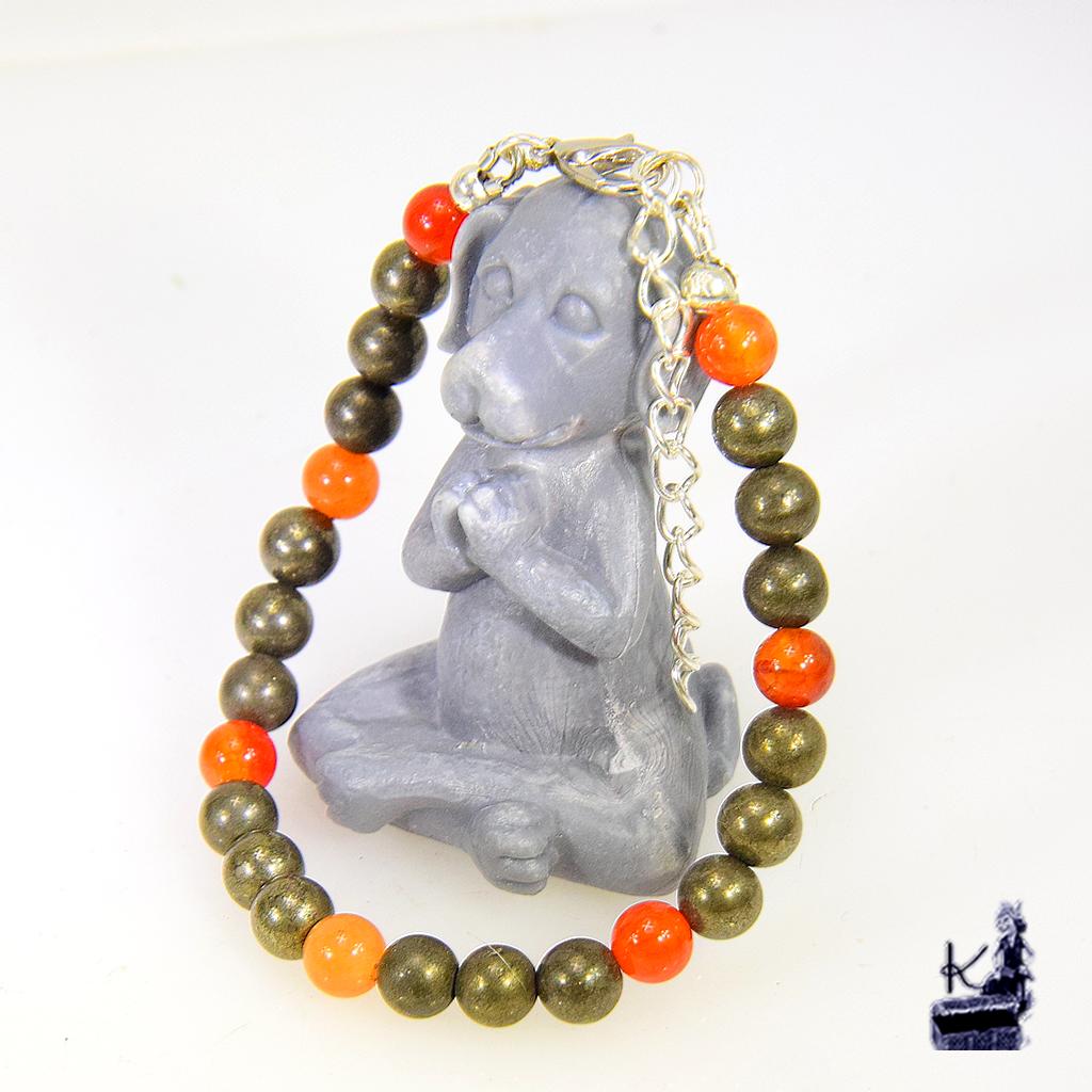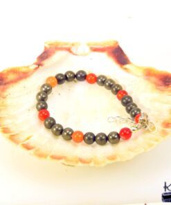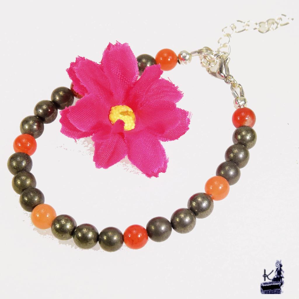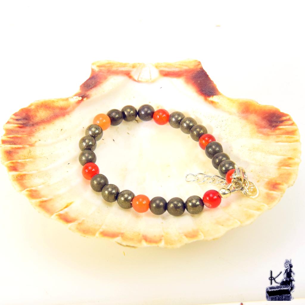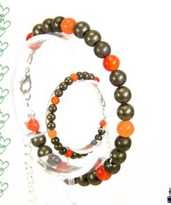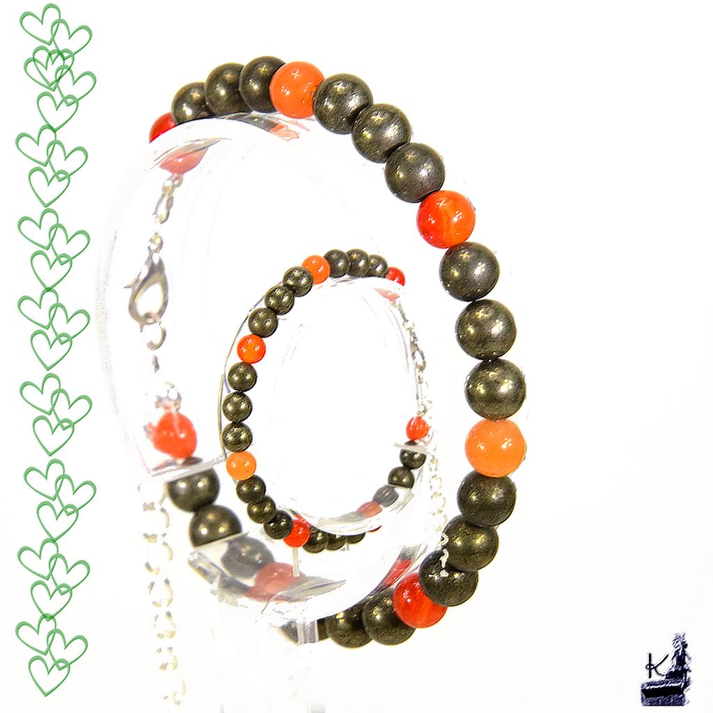 Pierres naturelles : Pyrite (éclats métalliques) et Cornaline (nuances orangées à rouges).