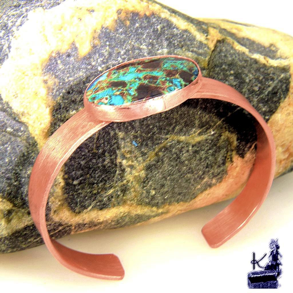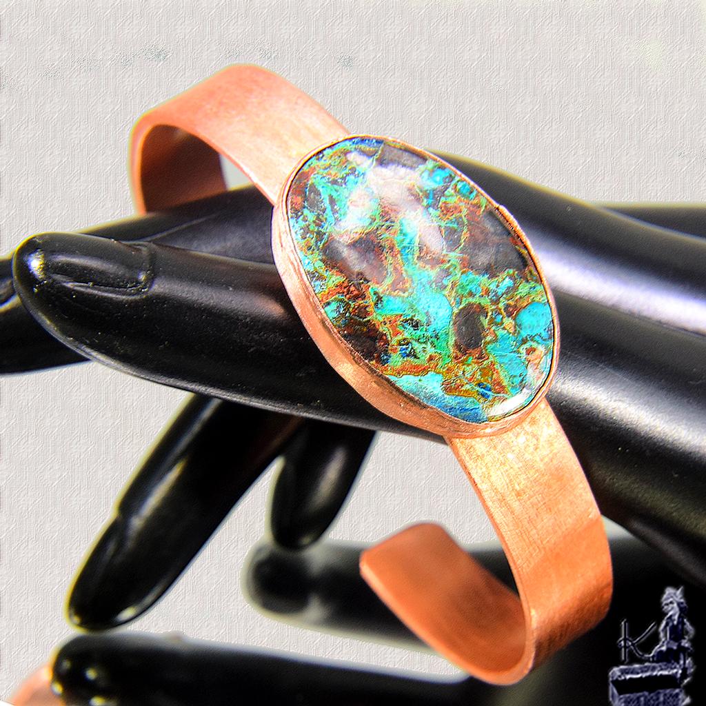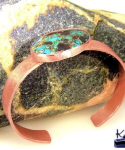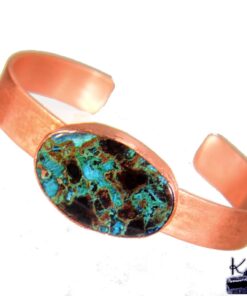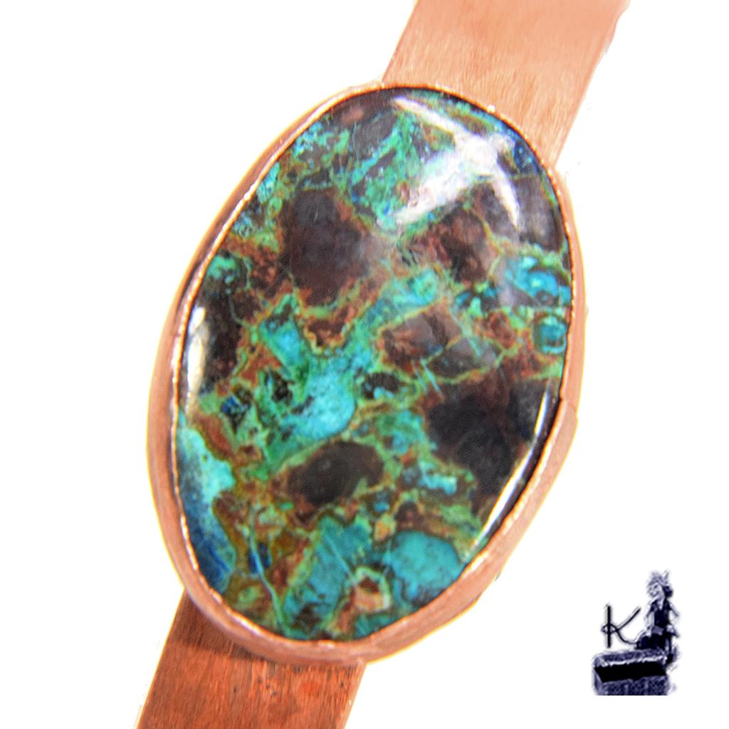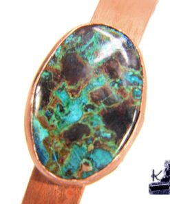 Au cœur de ma forêt sacrée, là où les mousses anciennes gardent les secrets de la Terre, naît une création aux nuances océaniques. Cette manchette unique, entièrement forgée à la main, est une invitation au voyage intérieur. L’éclat brut du cuivre naturel s’y marie à la profondeur d’un cabochon de chrysocolle, formant un talisman précieux qui semble avoir été poli par les esprits de la nature pour guider vos pas.