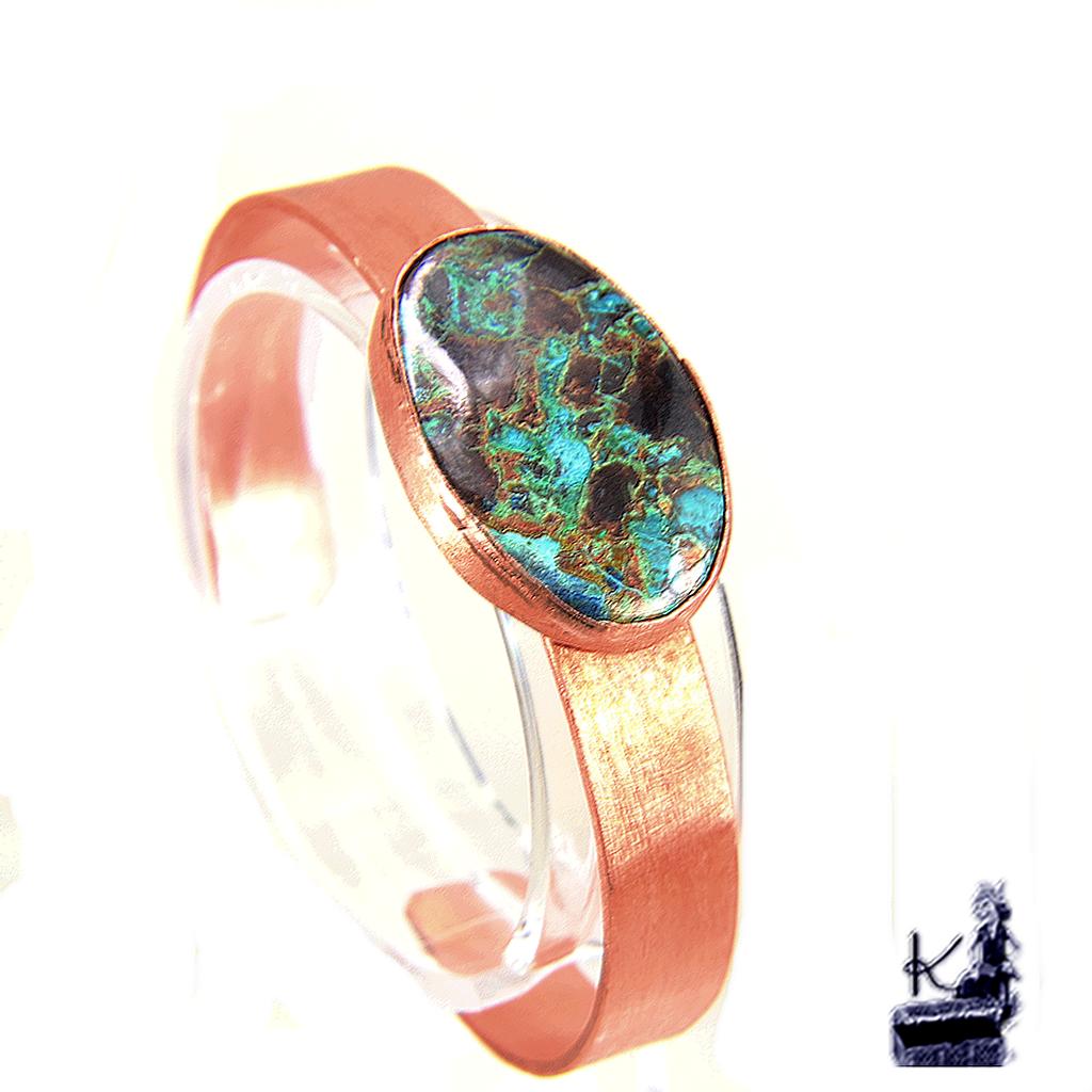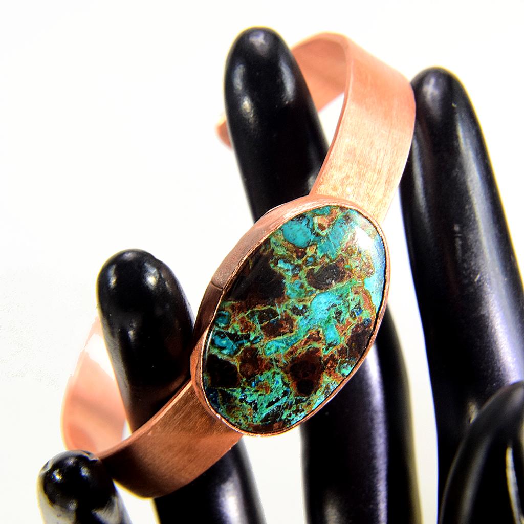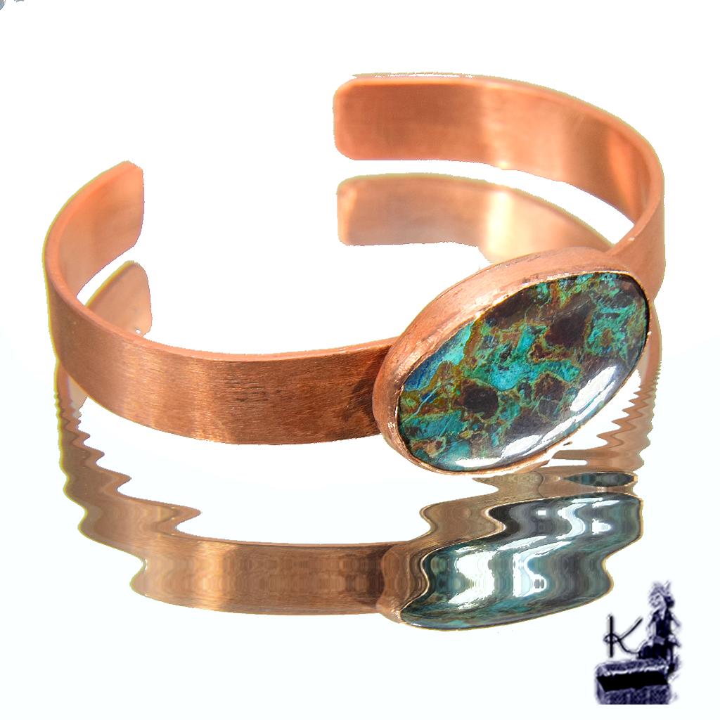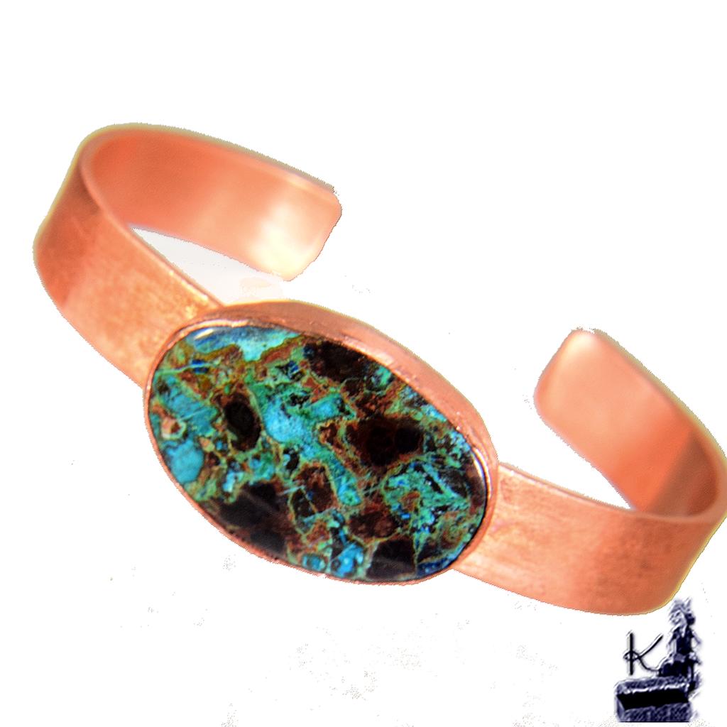 Au cœur de ma forêt sacrée, là où les mousses anciennes gardent les secrets de la Terre, naît une création aux nuances océaniques. Cette manchette unique, entièrement forgée à la main, est une invitation au voyage intérieur. L’éclat brut du cuivre naturel s’y marie à la profondeur d’un cabochon de chrysocolle, formant un talisman précieux qui semble avoir été poli par les esprits de la nature pour guider vos pas.