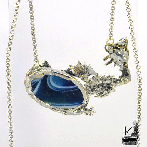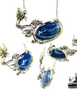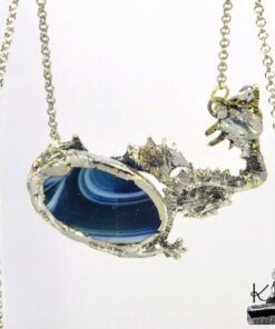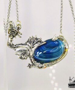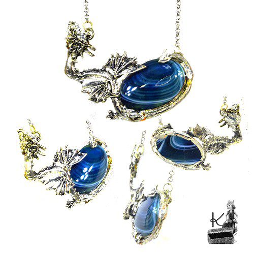 Pendentif entièrement fait main avec un cabochon ovale en agate rehaussé par un dragon argenté.