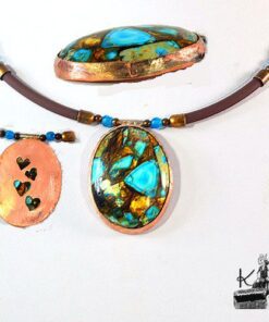 Matériel utilisé : feuille en cuivre naturel, cabochon en bornite cuivre, perles en cuivre, perles en topaz, silicone, éléments en cuivre