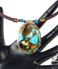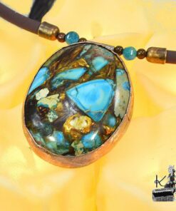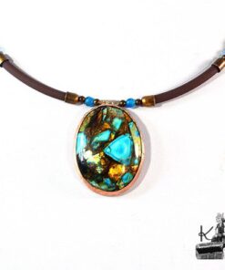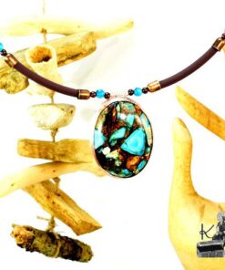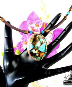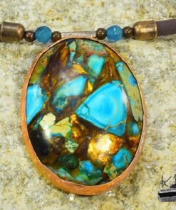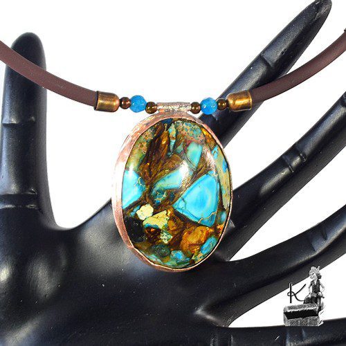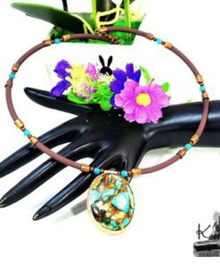 Un tour de cou est en silicone avec des perles cuivre et topaze réhaussé par une bornite cuivre sertie avec du cuivre naturel