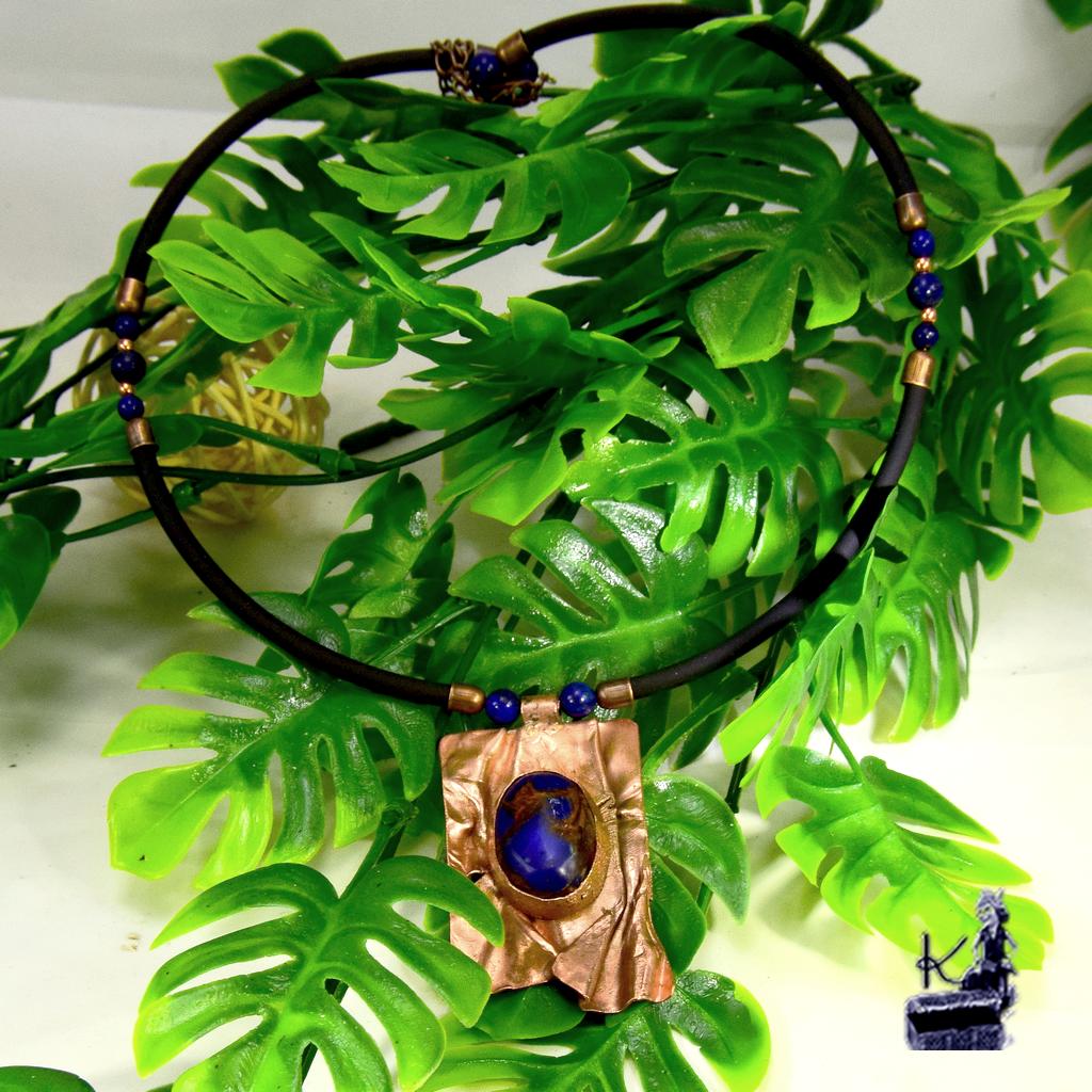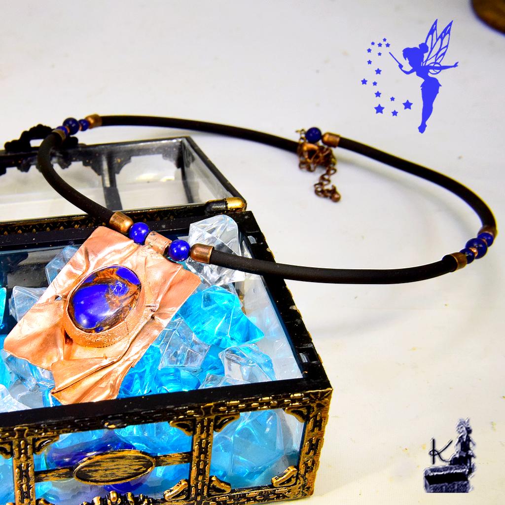 Tour de cou : Silicone noir élégant, orné de perles en Lapis-Lazuli et perles en cuivre.