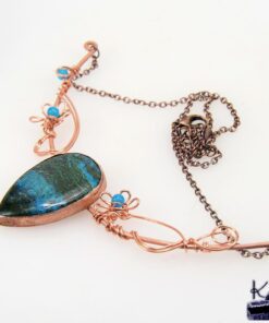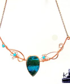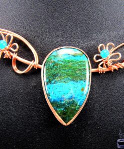 Ce collier est entièrement fait main en cuivre naturel avec une pierre en chrysocolle. Il fait parti d’une petite collection printanière.