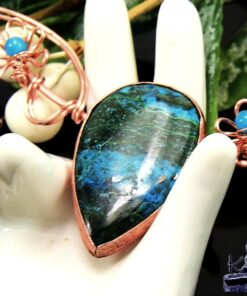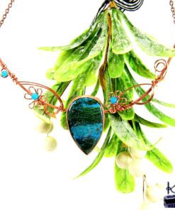 Matériel utilisé : cabochon en chrysocolle , feuille et fil en cuivre naturel, perles en topaze