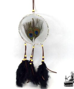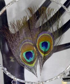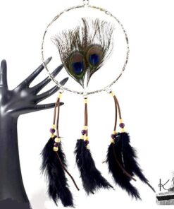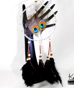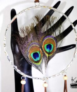 Cette décoration est un « Dreamcatcher » revisité. Fait entièrement à la main avec des plumes de paon, des plumes de décoration, de la suedine et des perles en bois, les plumes de la partie centrale sont mises sous verre avec diverses techniques du domaine du vitrail à base de cuivre et d’étain (garanti sans plomb !) et travaillé afin de donner un aspect « antique ».