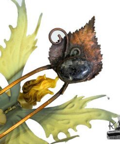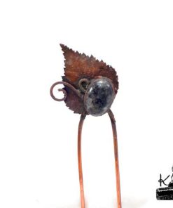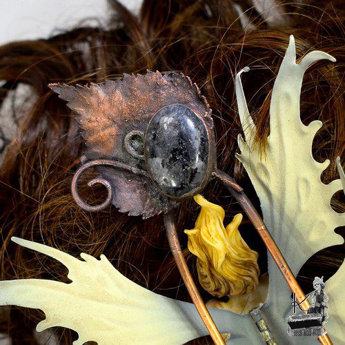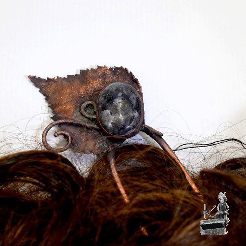Fourche à cheveux entièrement faite main avec du cuivre naturel patiné au sel avec une feuille naturelle et sa labradorite larvikite.