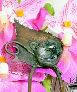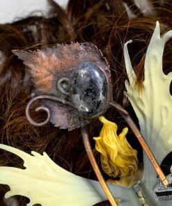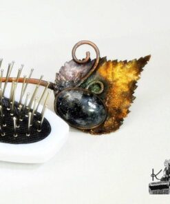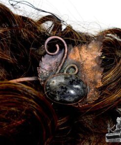 Matériel utilisé : Fil de cuivre naturel, plaquage cuivre, cabochon en labradorite larvikite, feuille naturelle