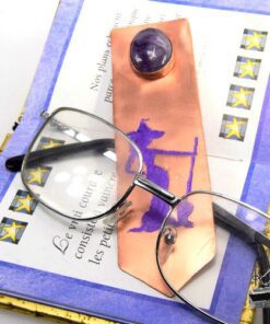 Véritable objet d’apparat pour bibliophile, ce marque-page est une pièce d’orfèvrerie ésotérique. Réalisé en cuivre naturel par un procédé d’électro-gravure en bain de sel, il arbore une silhouette de sorcière finement ciselée qui semble sortir d’un conte oublié. En son sommet est serti un cabochon d’Améthyste, une pierre bénie de la nature aux reflets violets hypnotiques.