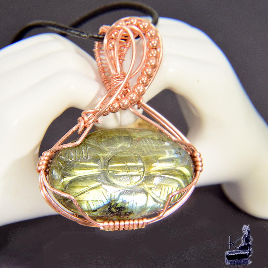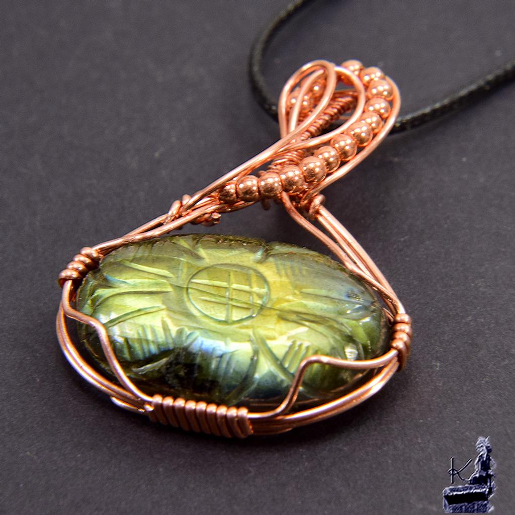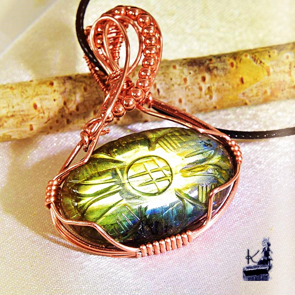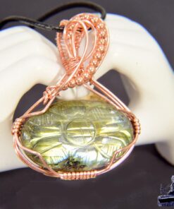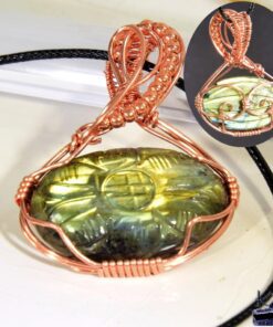 Ce pendentif artisanal « Murmure des Entités Blanches » en labradorite gravée et cuivre est un bijou de protection idéal en lithothérapie pour absorber les énergies négatives, stimuler l’intuition et stabiliser les humeurs.