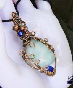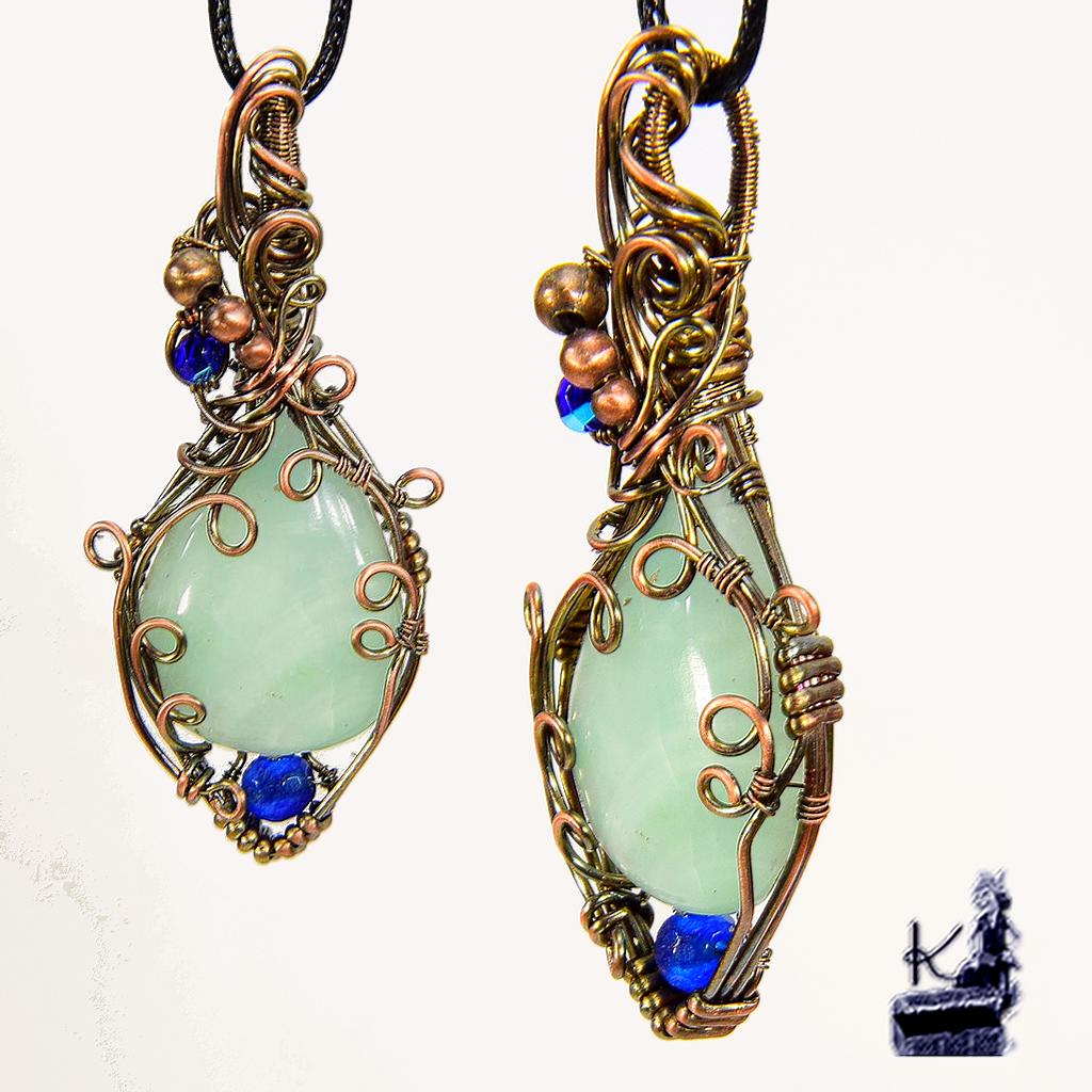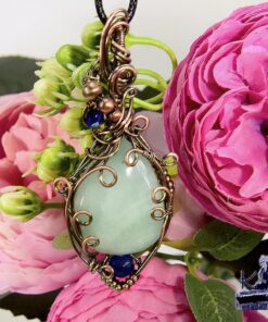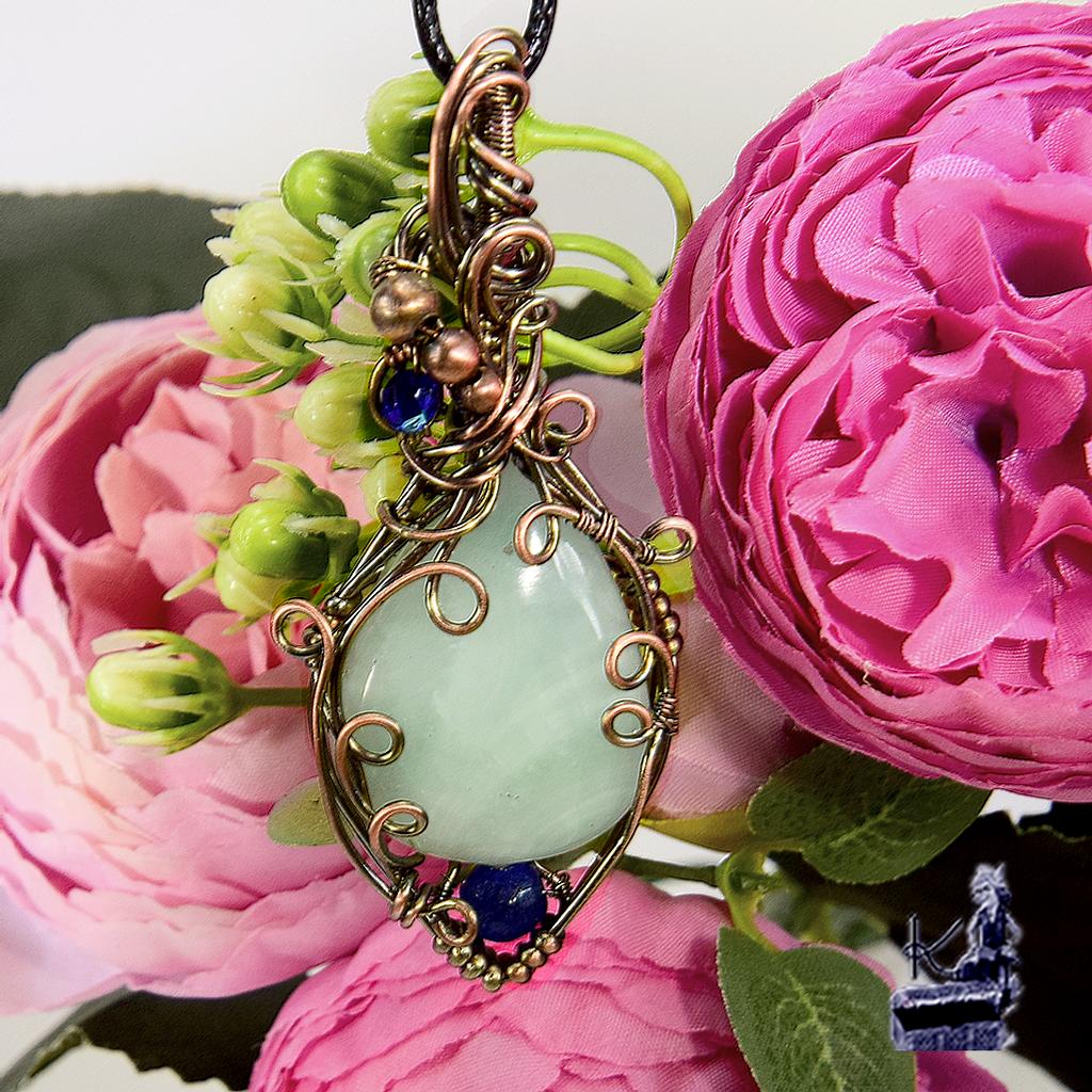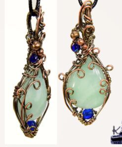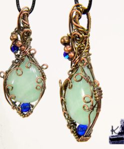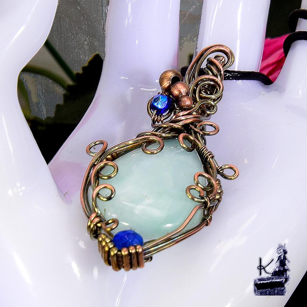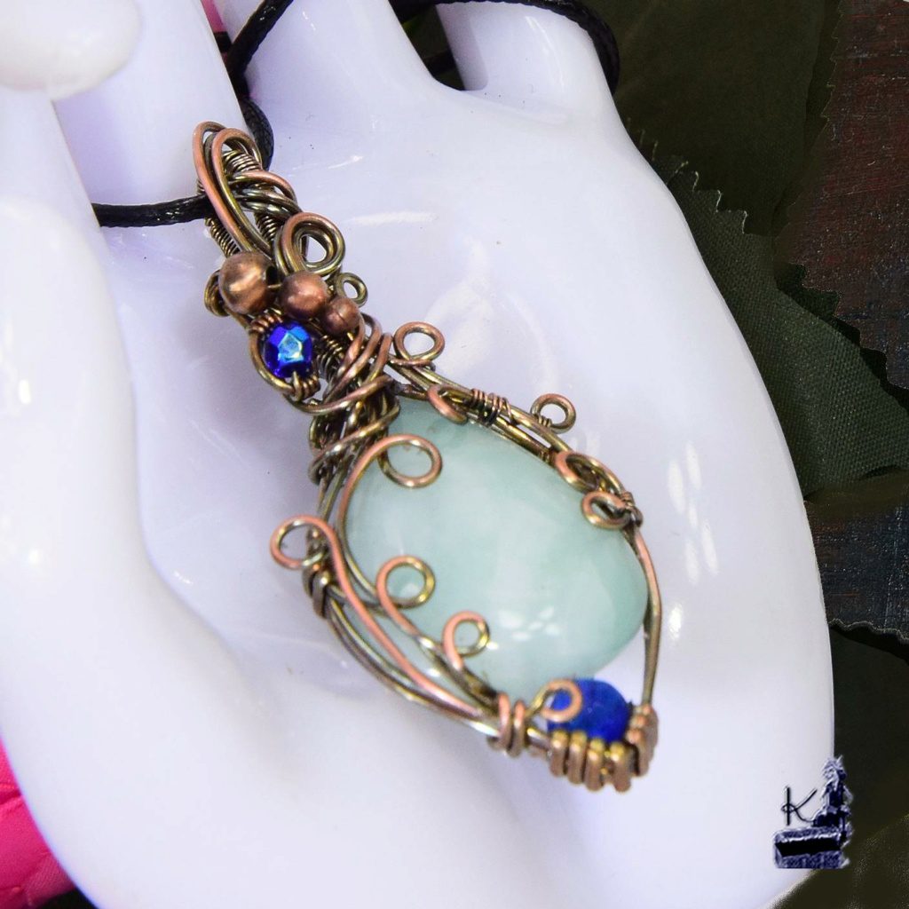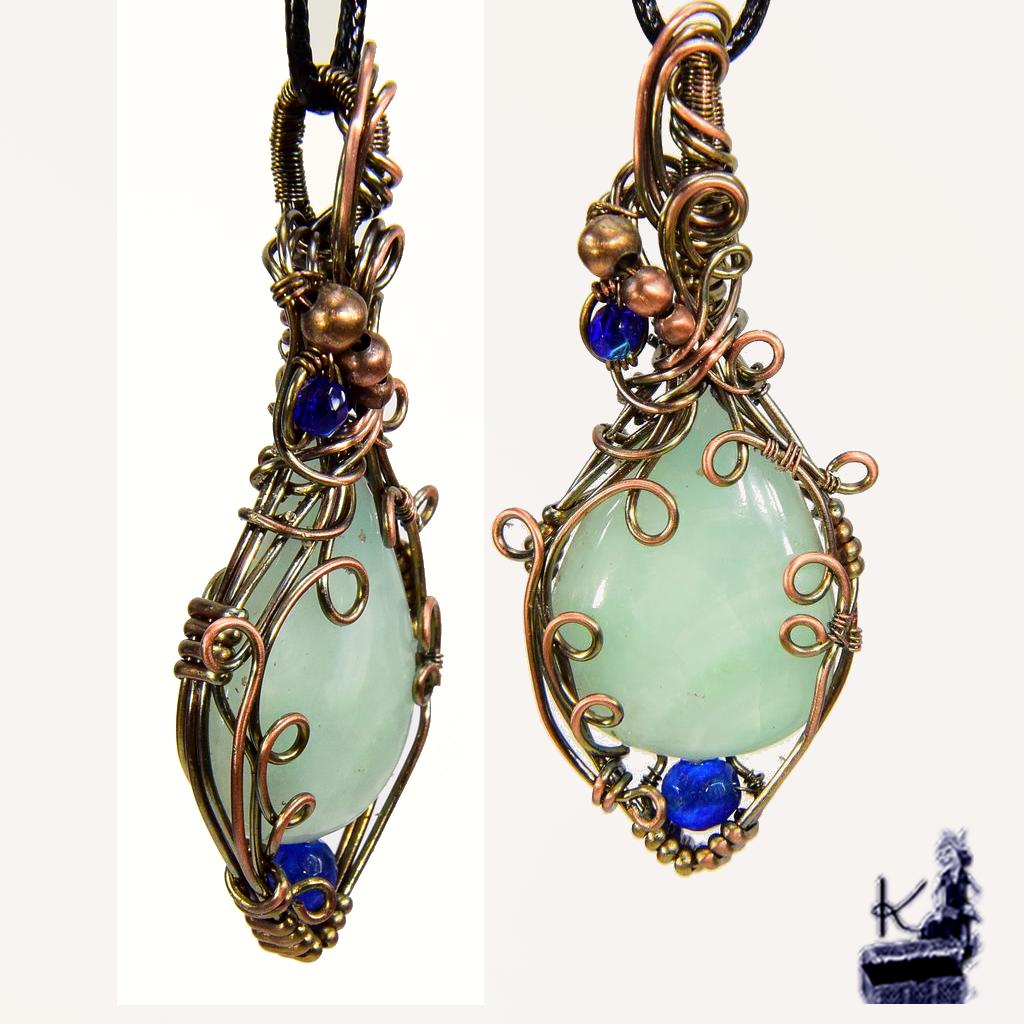 Pendentif en hémimorphite wire wrapped en cuivre naturel patiné au sel .