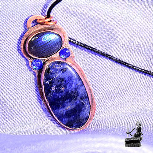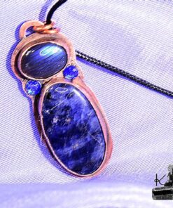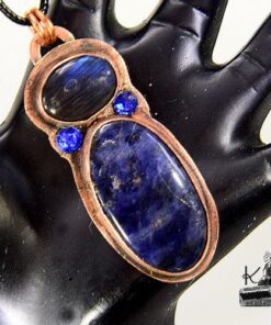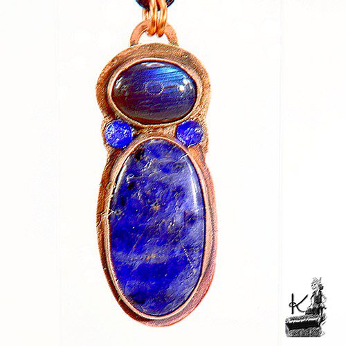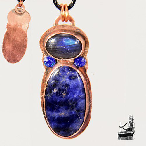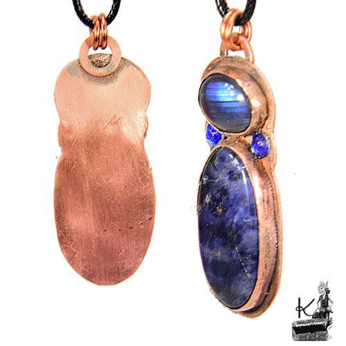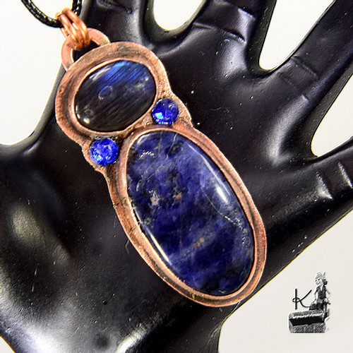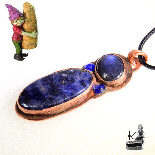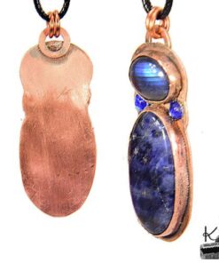 Matériel utilisé : fil et feuille en cuivre naturel, cabochon en labradorite, cabochon en onyx bleu, strass en Swarovski