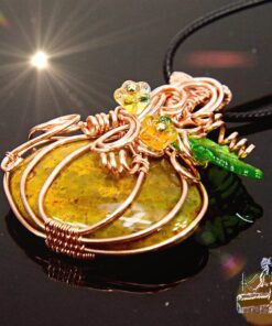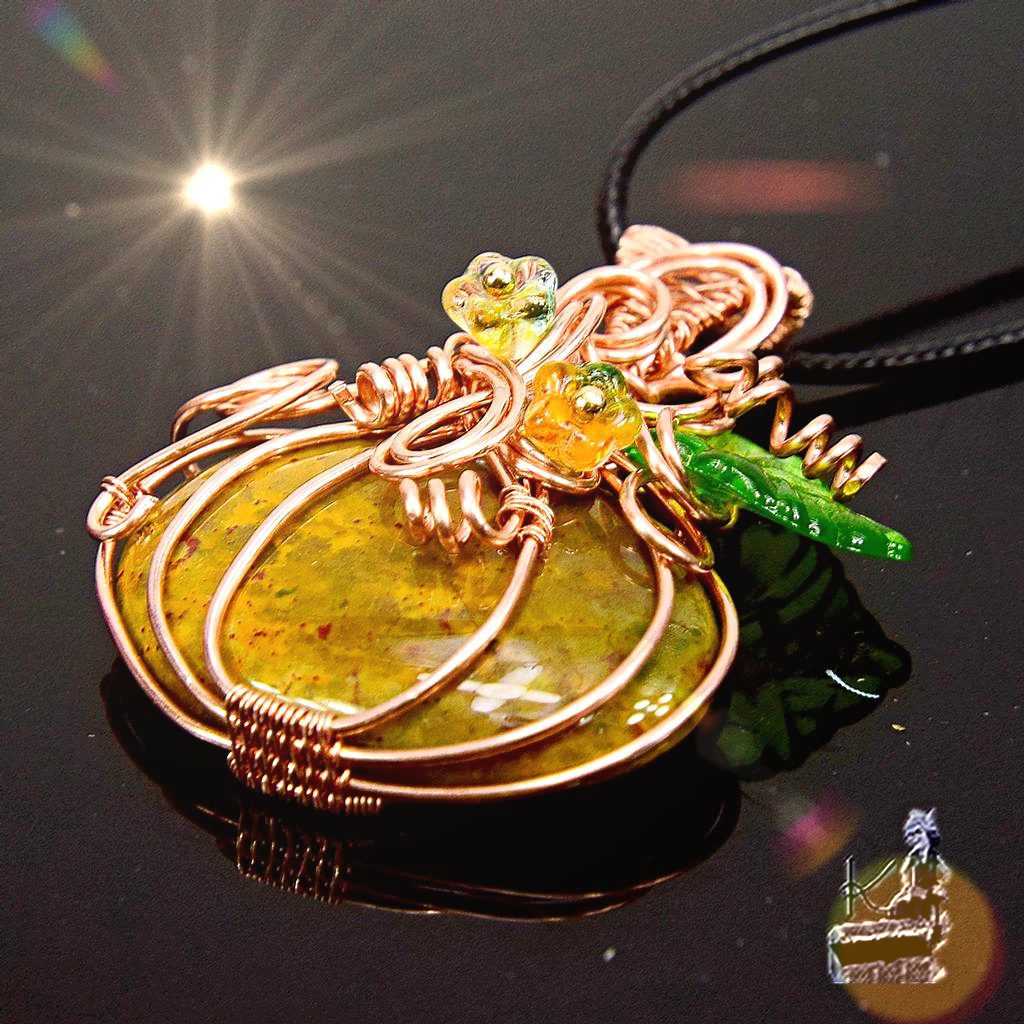 Matériel utilisé : fil en cuivre naturel , cabochon en bloodstone , feuille en acrylique , fleurs en verre tchèque