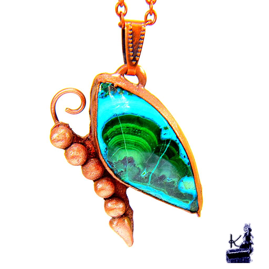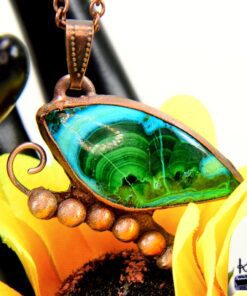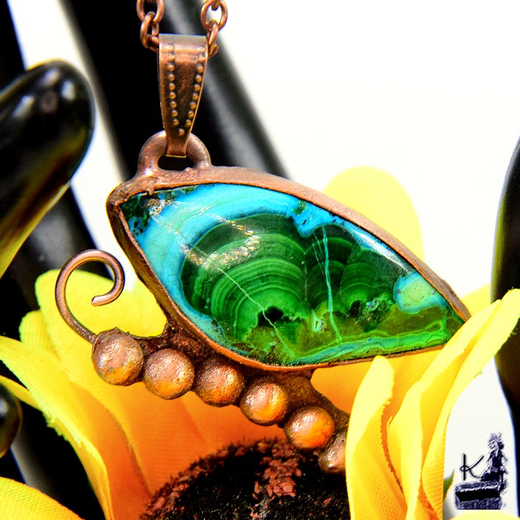 Pendentif unique en Chrysocolle malachite et en cuivre naturel .