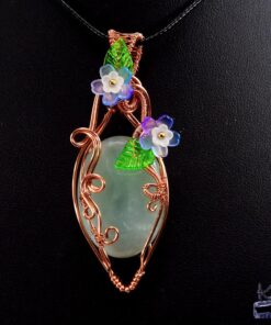 Pendentif en cuivre naturel avec une belle hémimorphite avec de petites fleurs et feuilles en acrylique ainsi qu’un pendentif coeur en cristal