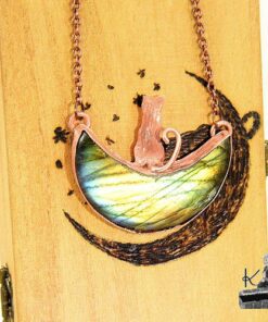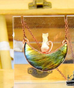 Le Bijou : Pendentif artisanal en forme de demi-lune, orné d’une Labradorite aux reflets mystérieux.