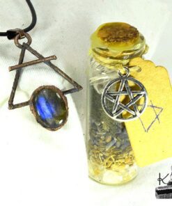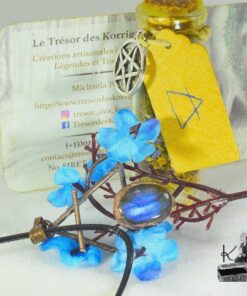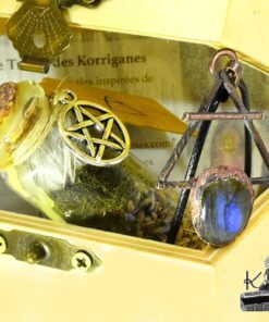 Cette trésor-box est composée d’une boite décorée et cirée en bois comprenant un pendentif symbole de l’air en cuivre avec sa jolie labradorite et une spell-jar dédiée ( voir photos ) Envoi gratuit par Colissimo.