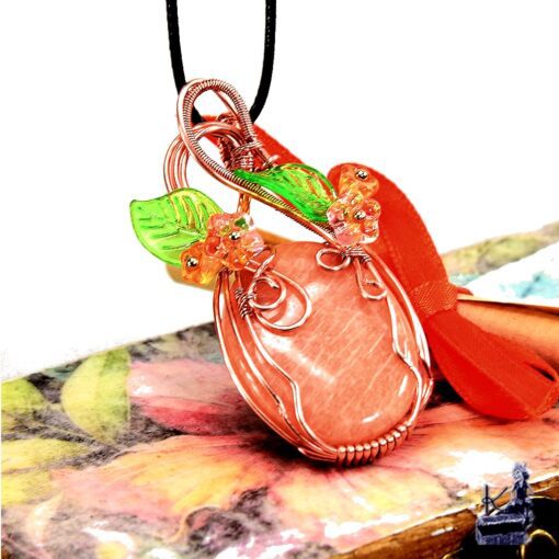Le Bijou : Pendentif artisanal en Amazonite Pêche véritable, serti selon la technique du wire wrapping (fil tissé).