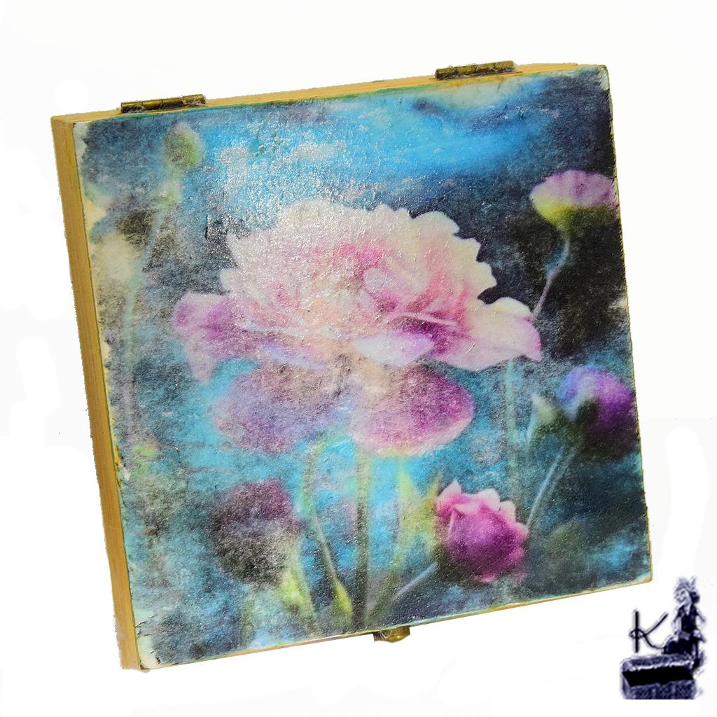 L’Écrin : Boîte en bois véritable, délicatement décorée et cirée à la main (12 cm x 12 cm x 5 cm).