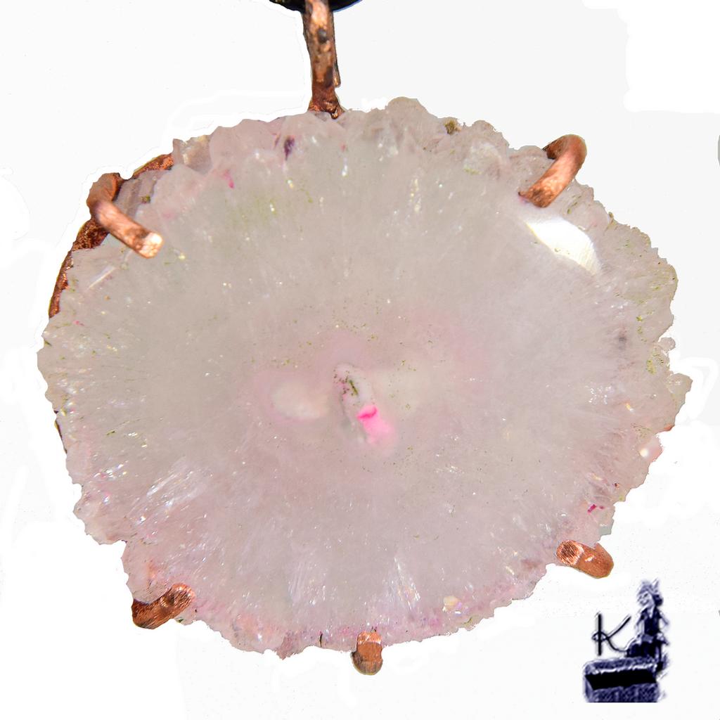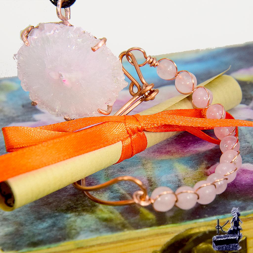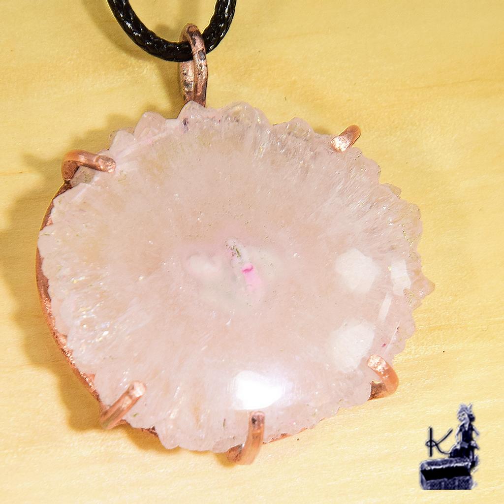Le Pendentif : Magnifique Solar Quartz rose serti artistiquement en cuivre naturel.