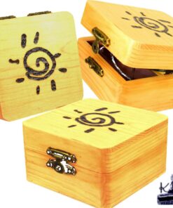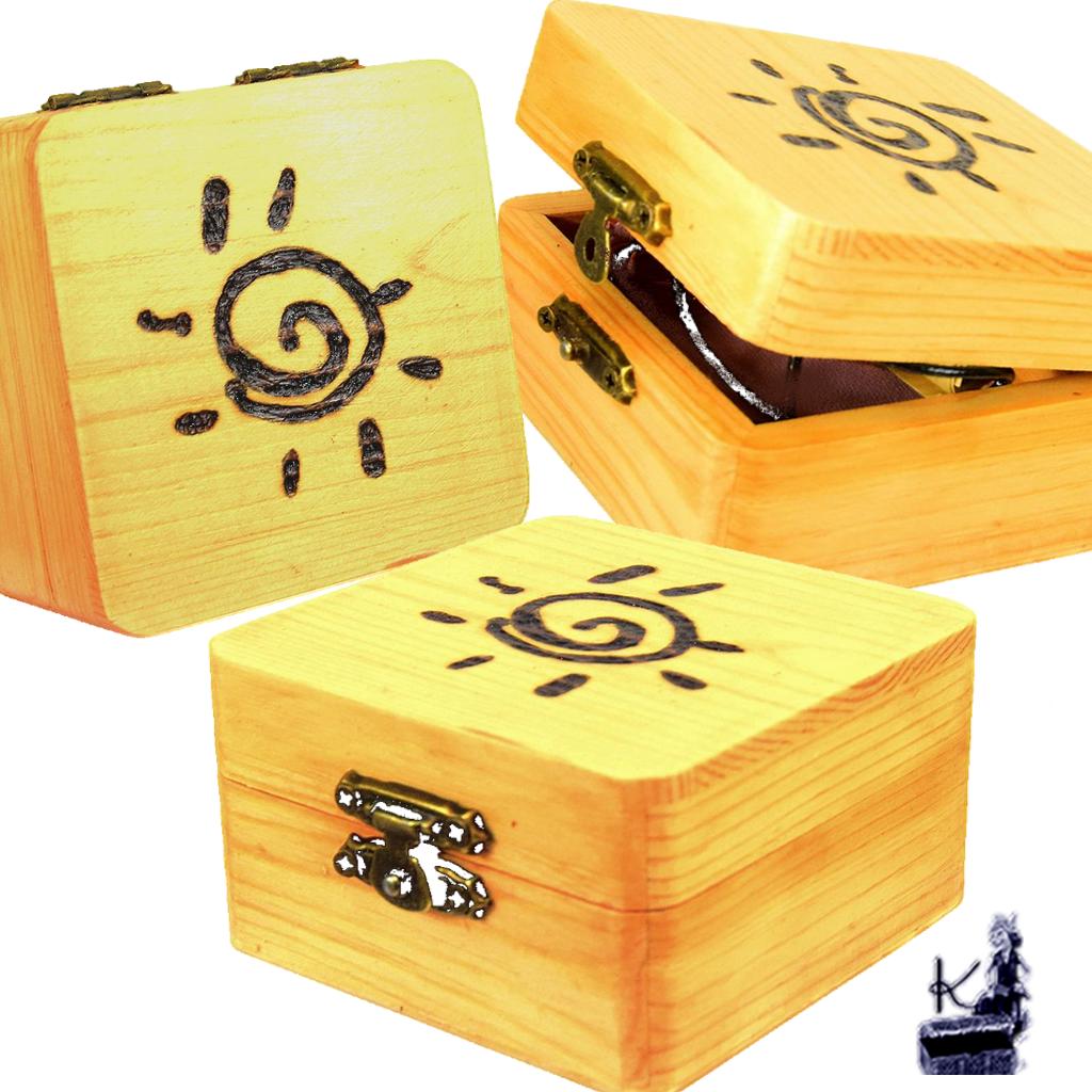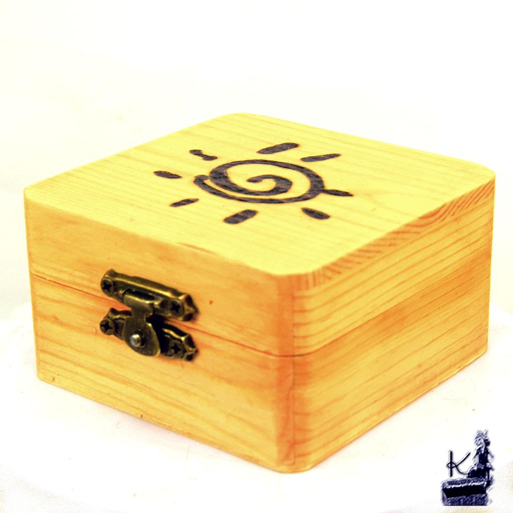 - L’Écrin : Boîte en bois véritable, ornée de pyrogravures artisanales et cirée à la main (8 cm x 8 cm x 4,5 cm).