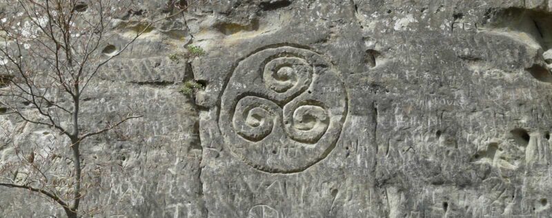 Commençons par le triskèle. (Parfois appelé triskèle – identique, les deux termes viennent du grec « à trois pattes »). Le triskèle est une triple spirale dont les bras ou les jambes sont équidistants. Il existe de nombreuses variantes de ce symbole. Les spirales peuvent être courbées ou fortement inclinées, à une ou deux lignes. Parfois, les bras se rejoignent en un seul point, ou parfois forment un triangle au centre. Souvent, les spirales s’incurvent vers la droite du spectateur, suggérant une rotation vers la droite, mais pas toujours.
